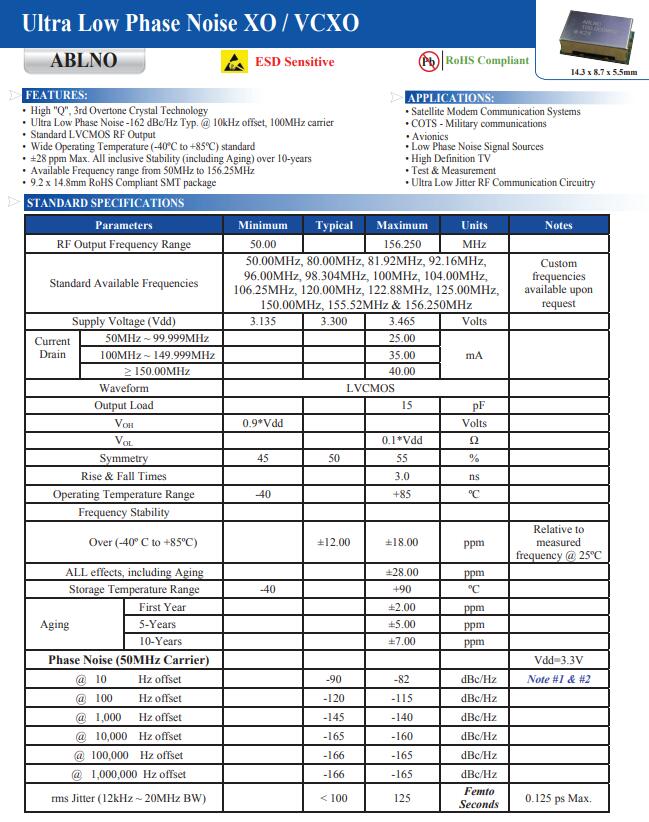 ABRACON旗艦ABLNO系列提供超低相位噪聲固定時鐘或電壓控制晶體振蕩器(VCXO)解決方案標準尺寸為9x14mm。同超過12 kHz的37fs典型RMS抖動20MHz帶寬@ 100MHz載波,ABLNO是性能驅動的理想選擇通訊,射頻,無線回程,和儀器應用。