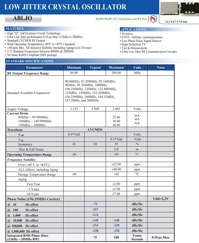 ABRACON旗艦ABLNO系列提供超低相位噪聲固定時(shí)鐘或電壓控制晶體振蕩器(VCXO)解決方案標(biāo)準(zhǔn)尺寸為9x14mm。同超過(guò)12 kHz的37fs典型RMS抖動(dòng)20MHz帶寬@ 100MHz載波,ABLNO是性能驅(qū)動(dòng)的理想選擇通訊,射頻,無(wú)線回程,和儀器應(yīng)用。