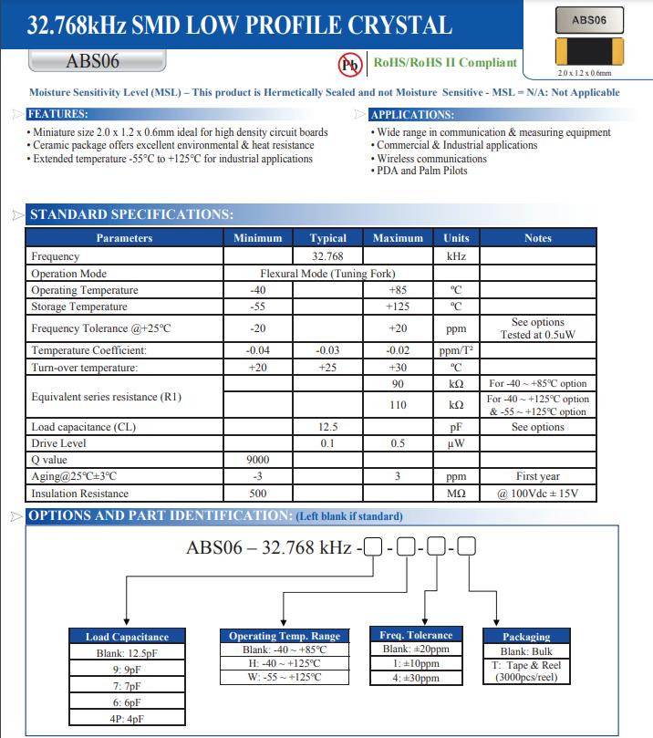 | ABS06-32.768KHZ-T | Abracon LLC | ABS06 | 32.768 kHz | ±20ppm | 12.5pF |