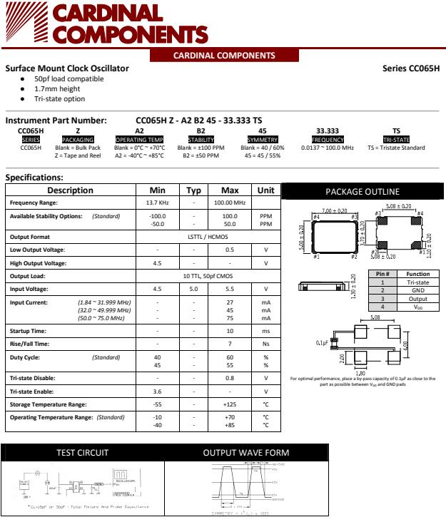 美國卡迪納爾晶振,CC065H石英晶體振蕩器,CC065HZ-A2B240-26.000TS晶振