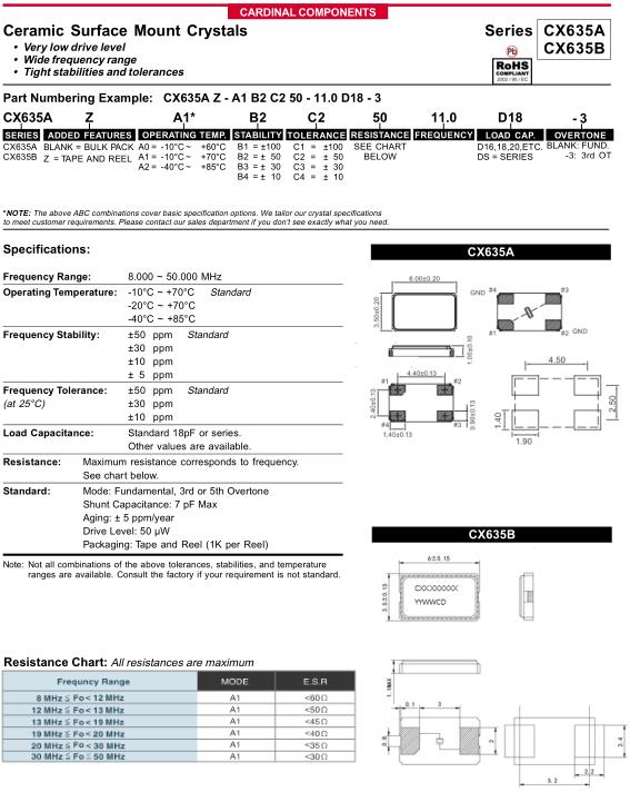 Cardinal卡迪納爾晶振,CX635A無源四腳晶振,CX635AZ-A2B3C350-11.0D18-3晶振