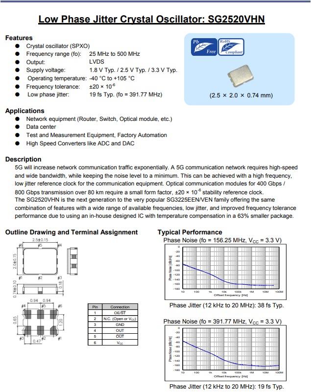 愛普生晶振SG2520VHN是非常受歡迎的SG3225EEN/VEN系列的下一代產品,提供相同的功能組合,具有廣泛的可用頻率、低抖動和更高的頻率容差性能,因為它采用了內部設計的溫度補償IC,封裝尺寸減小了63%。SG2520VHN有源晶振支持LVDS輸出差分晶振,工作溫度可達到-40℃至+105℃,電源電壓1.8V至3.3V,寬頻率范圍25MHz至500MHz任意一頻點具有低電源電壓,滿足產品低消耗電流特點,具有超小型,輕薄型,低電源電壓,低抖動,低功耗,低損耗,低耗能,低相位噪聲等特點,被廣泛用于通訊設備,機頂盒,光端機,安防設備及各種頻率控制設備上。 應用于5G網絡設備專用晶振X1G005941000215,X1G005941001115,差分晶振