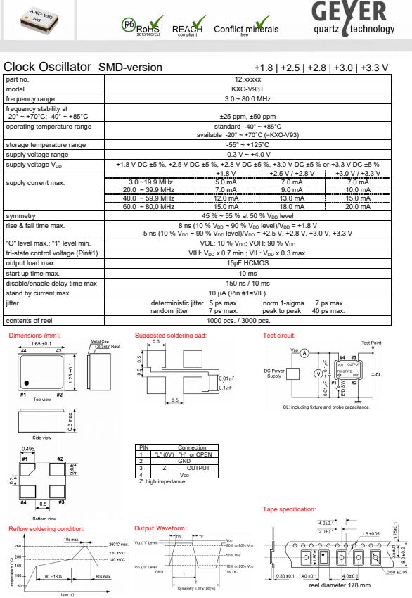 不建議從中間電位和/或極快速通電,否則會導致無法產生振蕩和/或非正常工作.GEYER格耶晶振,KXO-V93T超小型晶振,有源晶體振蕩器.