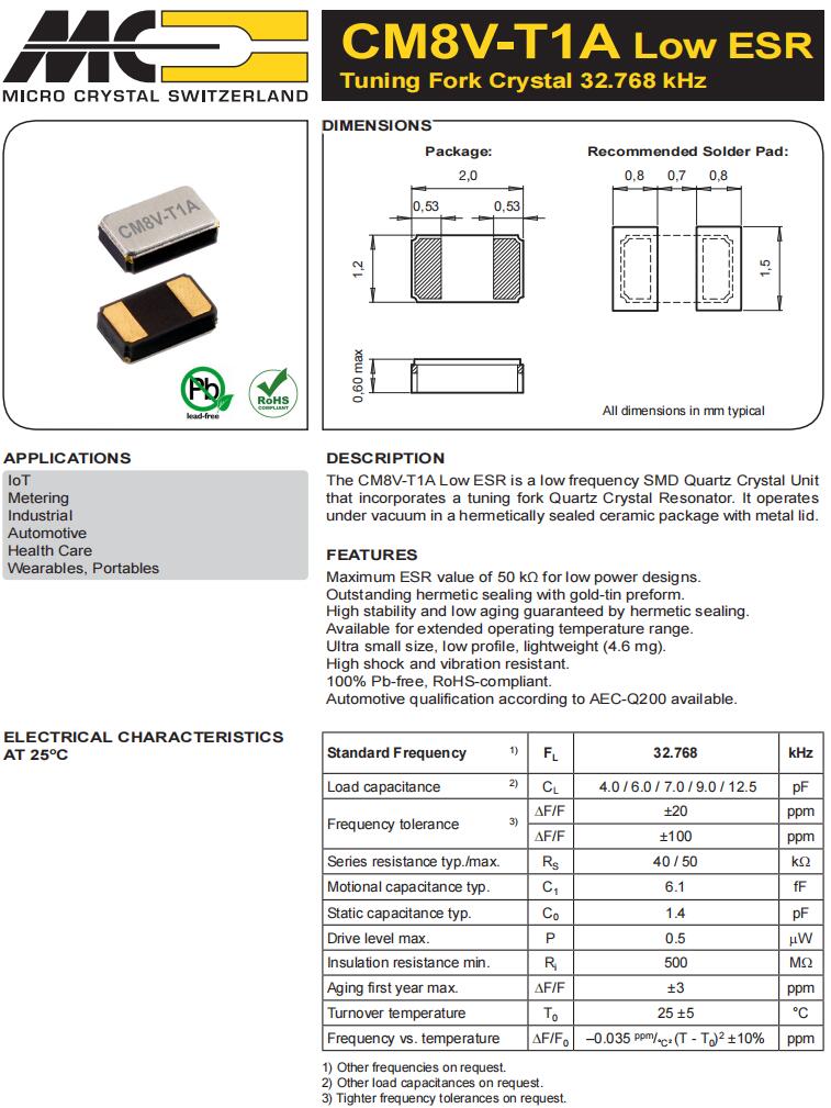| CM7V-T1A-32.768kHz-12.5pF-100PPM-TA-QC | Micro Crystal | 晶體 32.768 kHz 12.5 pF +/-100 PPM -40/+85C |