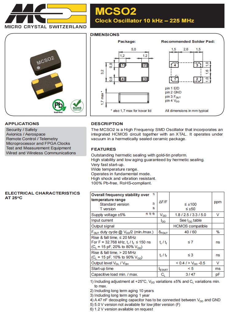 MCSO2FKHVT-C-40.000MHz-E/D-T3|低抖動晶振|6G模塊晶振,瑞士微晶晶振,MCSO2有源晶振,MCSO2FKHVT-C-40.000MHz-E/D-T3晶振,5032mm晶振,進口SMD晶振,頻率40MHz,電壓3.3V,頻率穩定性50ppm,工作溫度-55~125°C,高穩定性晶振,耐高溫晶振,6G模塊晶振,微處理器晶振,測試和測量設備晶振,有線和無線通信晶振,航空電子晶振.
