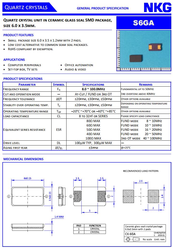 NKG晶振|S6GA20.000F12M2Z-EXT|6035低成本晶振規格表