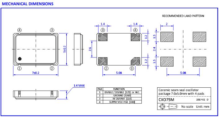 NKG晶振|SCO3-6-B-25.0000-MTS-EXT|7050mm貼片晶振尺寸圖
