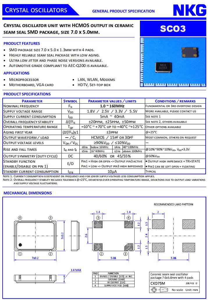 NKG晶振|SCO3-6-B-25.0000-MTS-EXT|7050mm貼片晶振規(guī)格表