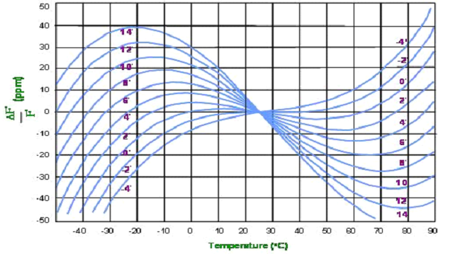 大部份的石英晶體產品是用于電子線路上的參考頻率基準或頻率控制組件, 所以, 頻率與工作環境溫度的特性是一個很重要的參數. 事實上, 良好的頻率與溫度(frequeny versus temperature)特性也是選用石英做為頻率組件的主要因素之一. 經由適當的定義及設計, 石英晶體組件可以很容易的就滿足到以百萬分之一 (parts per million, ppm) 單位等級的頻率誤差范圍. 若以離散電路方式將LCR零件組成高頻振蕩線路, 雖然也可以在小量生產規模達到所需要的參考頻率信號誤差在ppm或sub-ppm等級要求, 可是這種方式無法滿足產業要達到的量產規模. 石英組件的頻率對溫度特性更是離散振蕩線路無法簡易達成的. 在(如圖) 中提供了數種不同的石英晶體切割角度的頻的對溫度特性曲線. NDK的發展:1948 年 在東京都中央區日本橋設立南部商工株式會社
