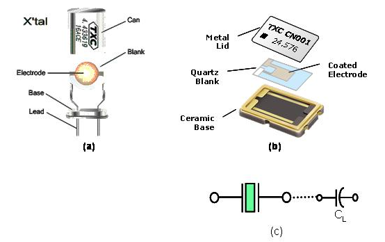 石英是由硅原子和氧原子組合而成的二氧化硅(Silicon Dioxide, SiO2), 以32點(diǎn)群的六方晶系形成的單結(jié)晶結(jié)構(gòu).單結(jié)晶的石英晶體結(jié)構(gòu)具有壓電效應(yīng)特性, 當(dāng)施加壓力在晶體某些方向時(shí), 垂直施力的方向就會(huì)產(chǎn)生電氣電位. 相對的當(dāng)以一個(gè)電場施加在石英晶體某些軸向時(shí), 在另一些方向就會(huì)產(chǎn)生變形或振動(dòng)現(xiàn)象. 掌握單結(jié)晶石英材料的這種壓電效應(yīng), 利用其發(fā)生共振頻率的特性, 發(fā)揮其精確程度作為各類型頻率信號(hào)的參考基準(zhǔn), 就是水晶震蕩器的設(shè)計(jì)與應(yīng)用. 因?yàn)槭⒕w具有很高的材料Q值,所以絕大部份的頻率控制組件,如共振子及振蕩器,都以石英材料為基礎(chǔ). 以石英為基礎(chǔ)的頻率控制組件可以依其壓電振動(dòng)的屬性, 可以分為體波(bulk wave)振動(dòng)組件及表面聲波(surface acoustic wave)振動(dòng)組件. 體波振動(dòng)組件如石英晶體共振子, 石英晶體濾波器及石英晶體振蕩器, 表面波振動(dòng)組件如表面波濾波器及表面波共振子.